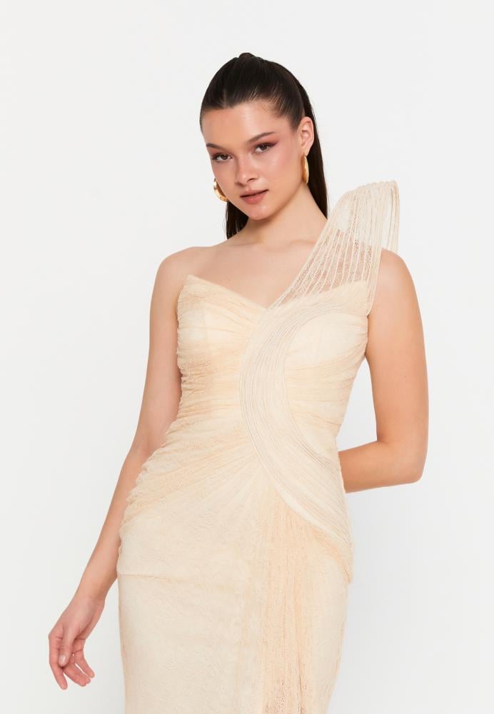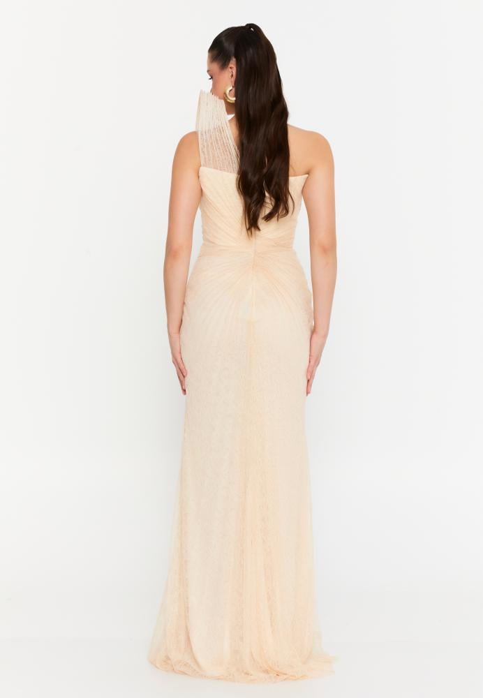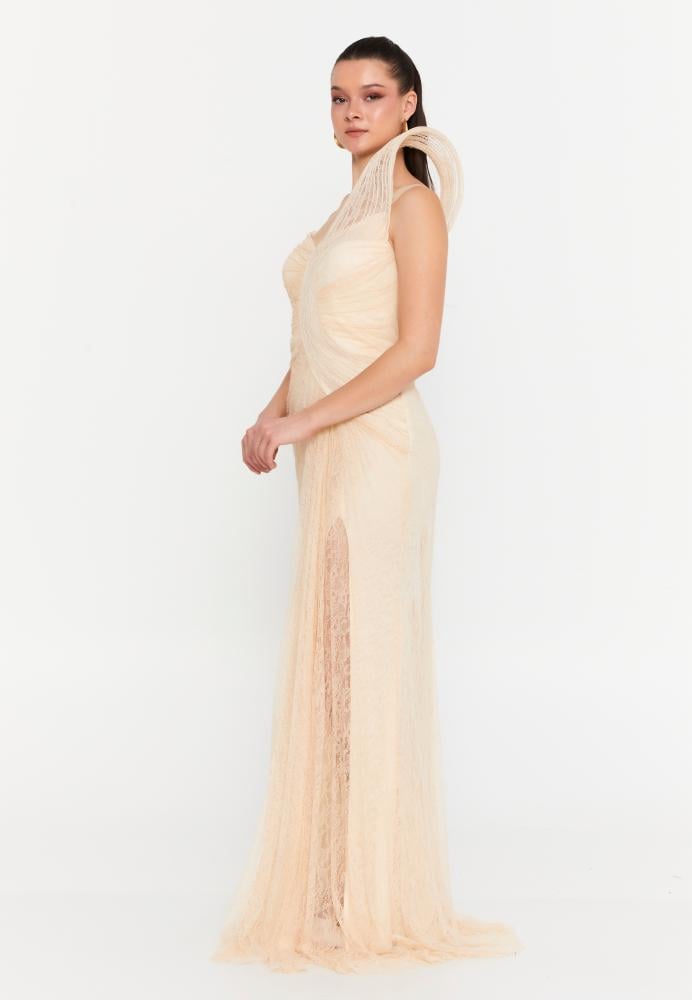 استقبلي موسم المناسبات بإطلالة تخطف الأنظار مع هذا الفستان الطويل المصنوع من الدانتيل والمخصص لضيوف حفلات الزفاف. يتميز بتصميم ميرميد أنثوي يبرز جمال القوام، وخامة خفيفة تناسب أجواء الربيع والصيف.