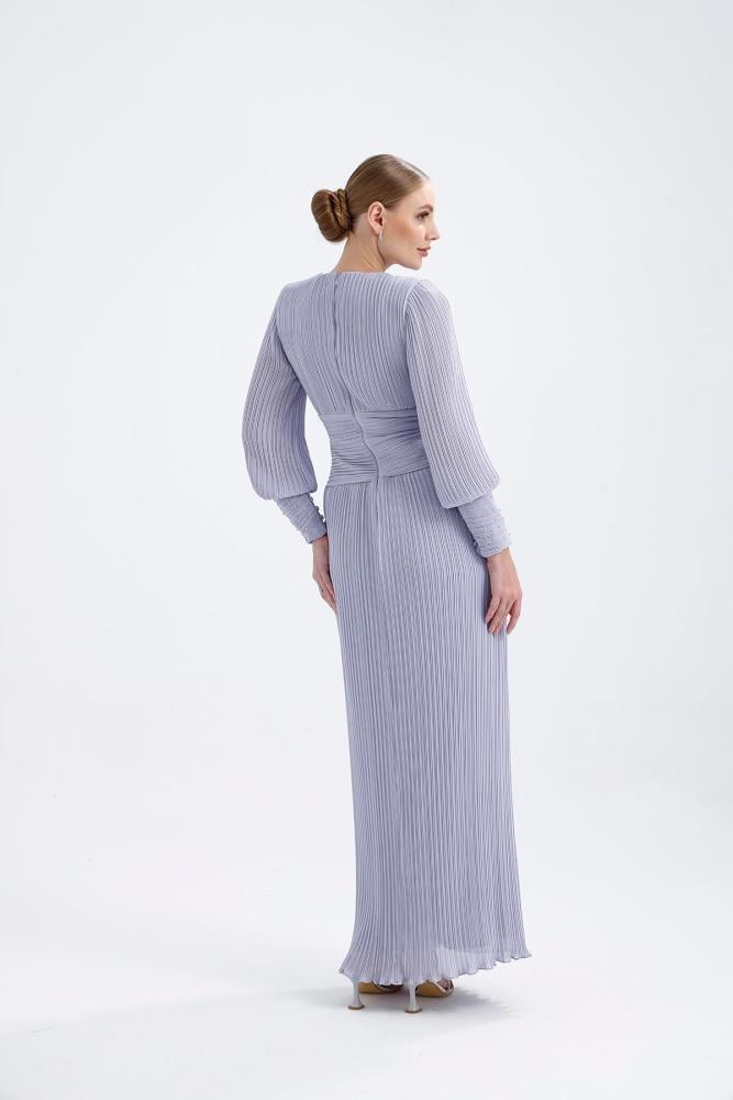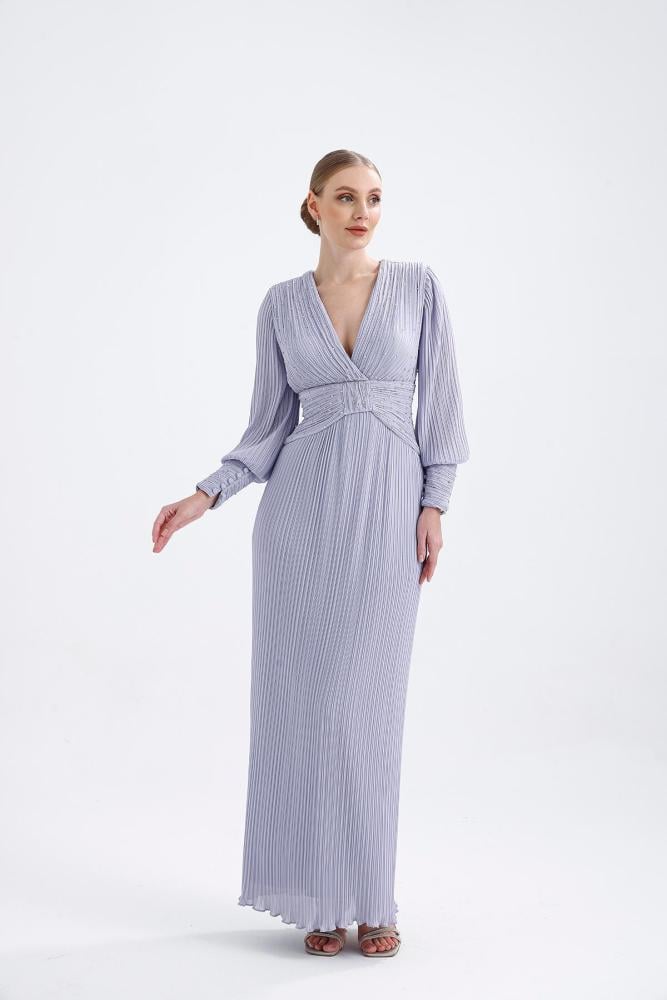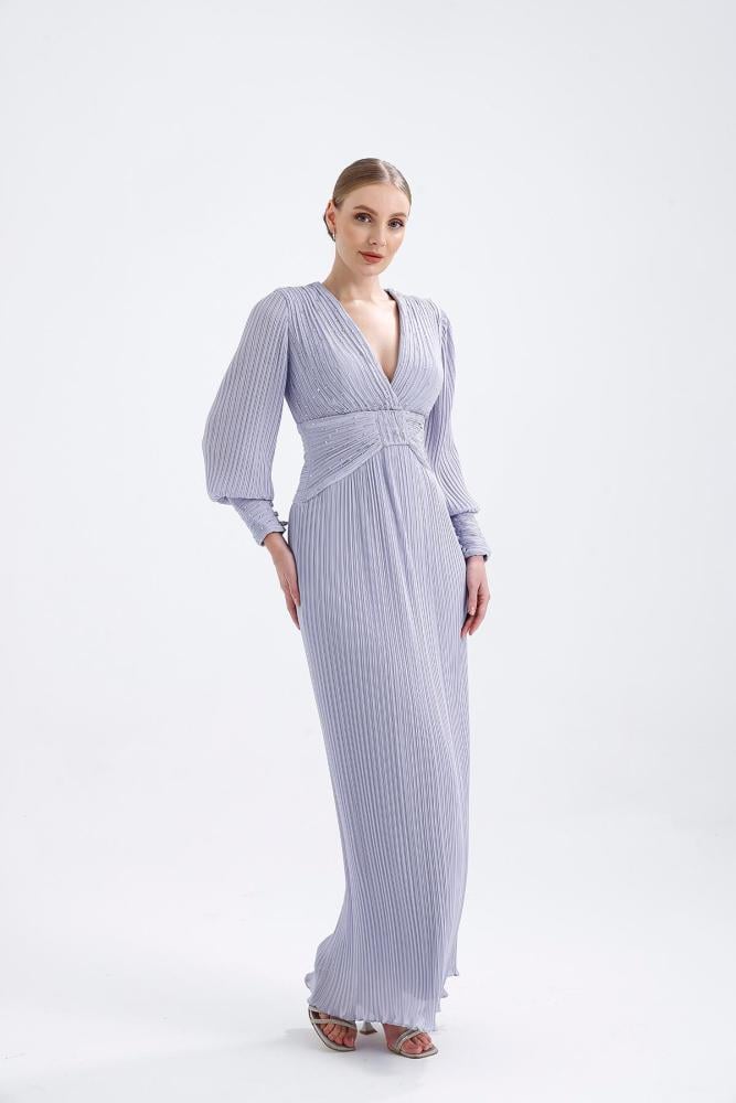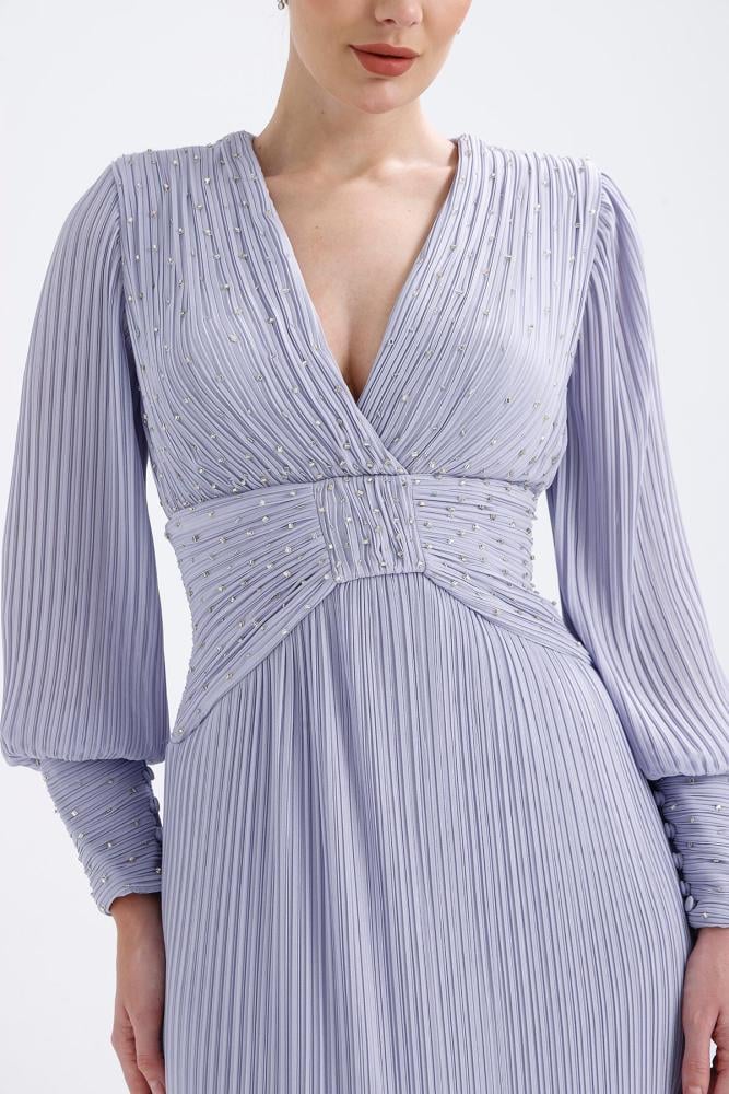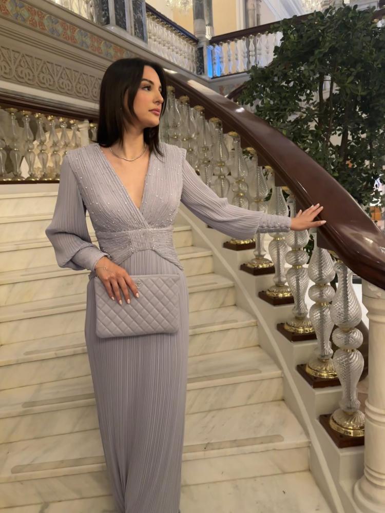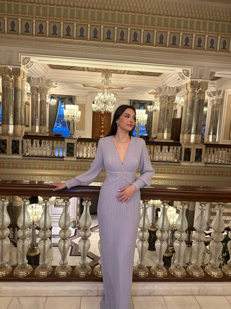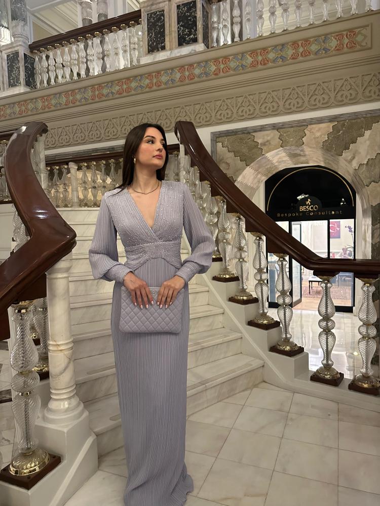 لأن كل لحظة تستحق أن تُخلَّد بإطلالة استثنائية، نقدّم لكِ فستان سهرة شيفون مطرز بتصميم أنيق ومتكامل يعكس ذوقًا رفيعًا. اللون البنفسجي الفاتح يضفي نعومة حالمة، أما الياقة على شكل V فتبرز جمال العنق وتمنح القوام مظهرًا ممشوقًا. الأكمام الطويلة والثنيات المتقنة على الخصر تضيف بُعدًا أنثويًا متوازنًا، بينما تمنحك الأحجار البراقة إحساسًا بالرقي من دون مبالغة. فستان مثالي للمرأة التي توازن بين البساطة والتميز في كل مناسبة.